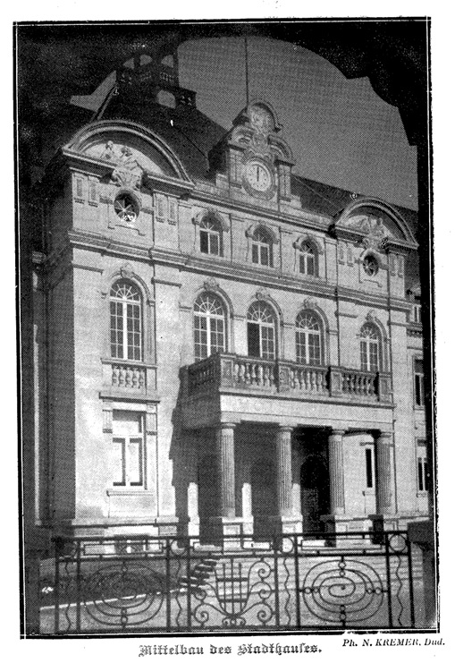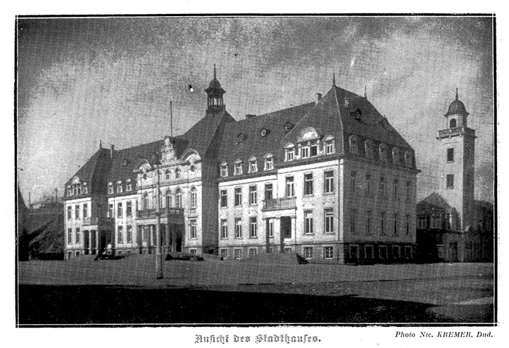 Im Jahre 1928 beschloß der Gemeinderat von Düdelingen, ein neues Rathaus zu bauen, und zwar gegenüber dem alten Gemeindehaus, welches später abgerissen wurde und heute unter anderem die »Spuerkeess« beherbergt.